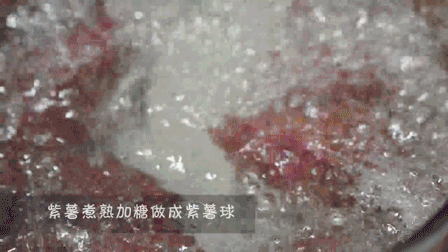 1. 準(zhǔn)備餡料。紫薯下鍋煮熟后取出剝皮,用勺子按壓成泥,加適量白糖攪拌均勻,準(zhǔn)備好的紫薯泥和紅豆沙揉成團(tuán)備用。