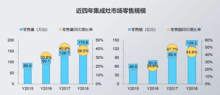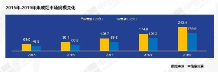 廚電產(chǎn)品作為每個家庭生活的必需品,目前在800億的廚電市場份額中,集成灶僅僅占據(jù)不到10%的市場份額。在過去的5年中,每年更是以接近60%的增速高速發(fā)展,其發(fā)展速度遠(yuǎn)遠(yuǎn)超過建材家居行業(yè)的任何一個品類,集成灶市場逐步成熟,市場規(guī)??焖僭鲩L。
